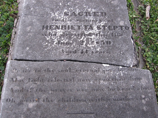 “At Georgetown, D.C., on Sunday, the 2nd instant, Henrietta Steptoe, aged 71 years. Near fifty years of her life were devoted exclusively to nursing the sick. By her assiduous, kind, and intelligent discharge of the duties of her humble office, she gained the confidence and affectionate respect of all who knew her. Few have contributed so largely as herself to alleviate the pains of the sick; her life has been spent in doing good; she will be long remembered as an humble friend and faithful nurse. Her funeral will take place at 10 o’clock A. M., (to-day,) at the house of her daughter, Mrs. Barker, on 4th st. in Georgetown.” Steptoe’s administrator was a prominent Georgetowner. “In the case of Henry C. Matthews, administrator of Henrietta Steptoe … with the approbation of the Orphan’s Court … final settlement of said estate, and for the payment and distribution … of the assets in the hands of the administrator … creditors and heirs … are hereby notified to attend … and file their claims, or they may be excluded.” A handsome ledger stone marks Steptoe’s grave in Holy Rood Cemetery.