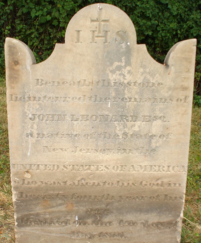 Beneath this stone lie interred the remains of John Leonard Esq., a native of the State of New Jersey in the UNITED STATES OF AMERICA, who was taken to his God in the sixty fourth year of his age. He died on the 4th day of May, 1836