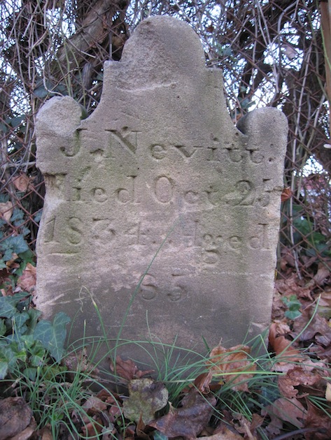 One of the oldest tombstones in Holy Rood Cemetery, scarred by mowing machinery.