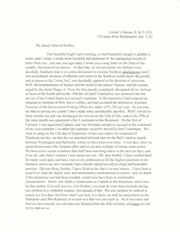 Capt. Phillip Louis Rodier, Contee’s Station, Maryland, “B. & O. R.R. (20 miles from Washington)”; to Julius Augustus Rodier, April 3, 1862. (Transcription courtesy of a descendant.)