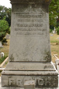 Initially buried in Fort Leavenworth National Cemetery, his body was exhumed, March 4, 1891 and reinterred in Holy Road Cemetery, Washington DC (lot 257, section 23), in a plot purchased May 13, 1880 by his sister, Adele B. French, of Tenleytown Road.