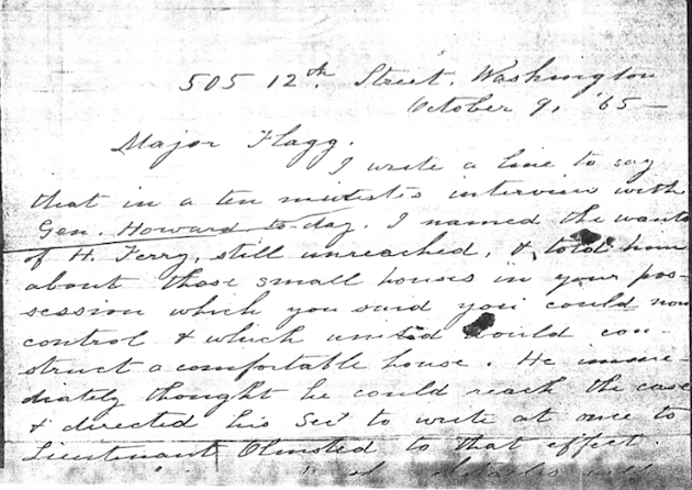 “At the quarterly meeting in July [1865], Mr. Baker, one of your Trustees, presented a communication from R.S. Cox, asking the Association to vacate the premises occupied as the Home, in consideration of receiving $1,000. Your Vice-President was advised…to wait upon the Attorney General, and other officers of the Government, to obtain their advice as to the proper course to be pursued. The Attorney General assured her that no pardon would be granted until an arrangement satisfactory to the Association should be effected. On the 19th of the same month the Board received a communication from the Trustees, enclosing a renewal of the offer of Mr. Cox. This was at once refused.” (Annual Report of the National Association for the Relief of Destitute Colored Women and Children, 1865)