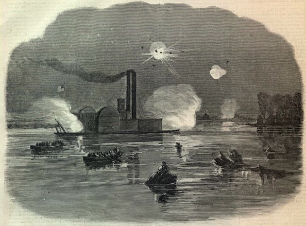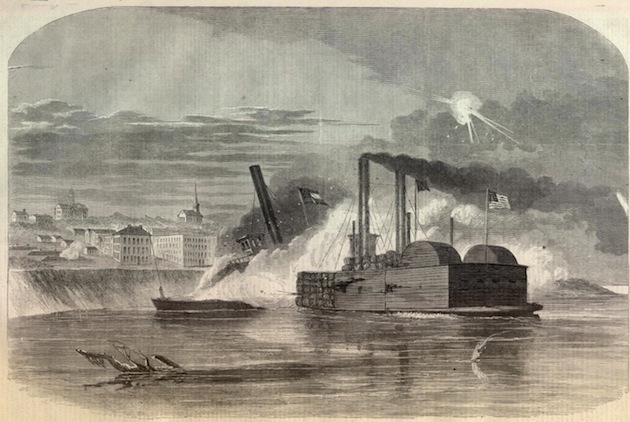 The Federal Ram “Queen of the West”, Col. Charles Rivers Ellet commanding, attacking the Confederate ship “City of Vicksburg” under the guns of the Vicksburg fortress, February 2, 1863.