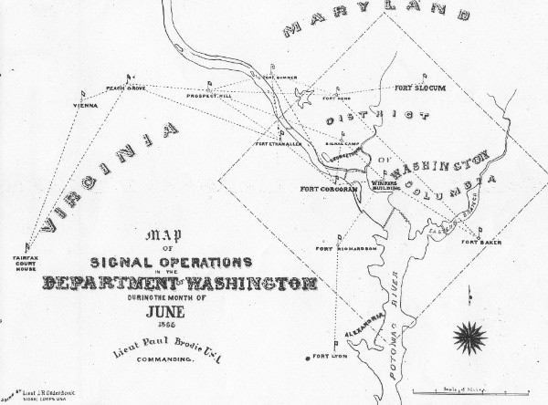 The Signal Camp was in line-of-sight communication with a tower eight miles upriver, at Peach Grove (now Tyson’s Corner), and with the main signal station, on the roof of the Winders Building, next to the White House. Messages were conveyed by waving a flag to the right or left in a binary code. At night, turpentine torches on long poles took the place of flags. All signals made in view of the enemy were in cipher. (The Signal Corps in the War of the Rebellion)
