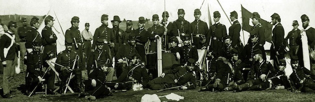 Major Myer was only a political casualty. He was relieved of his duties as Chief Signal Officer by the Secretary of War; the bone of contention was control of military telegraphy. When the Signal Camp was closed in 1865, Myer was photographed with some of the men who served under him: he is the one in civilian clothes. (Myer was later reinstated, after Secretary Stanton’s temper had cooled.)