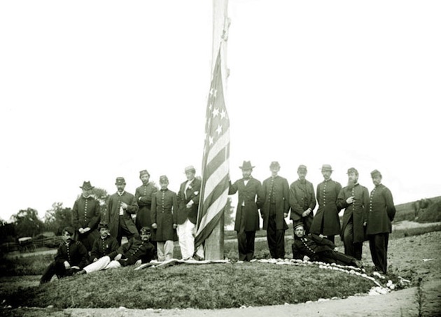Red Hill, Georgetown, D.C., August, 1865; Albert J. Myer is in civilian clothes, holding the flag.