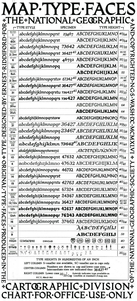 Shortly thereafter, Society cartographer Charles E. Riddiford was tasked with designing typefaces with much improved photomechanical reproductive qualities. He devised a set so attractive and legible that these typefaces are still used (in a digital format) today. These patented fonts were designed with the purpose of reflecting, as well as accentuating designated map features. If you study our reference maps and atlases closely, it’s quite evident that every feature is associated with a specific typeface. Color and typographic weight (from light to bold) further adds to this distinction.