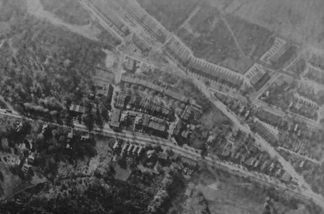 The occasional “doubling” of features––such as 37th Street, at bottom center––in this composite photograph shows where two aerial photos were cut to meet. (Aerial Photographic Mosaic Map, 1922)