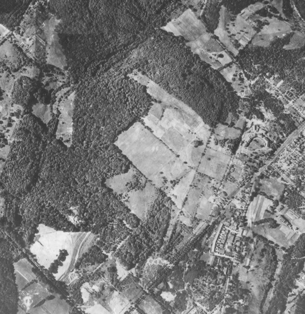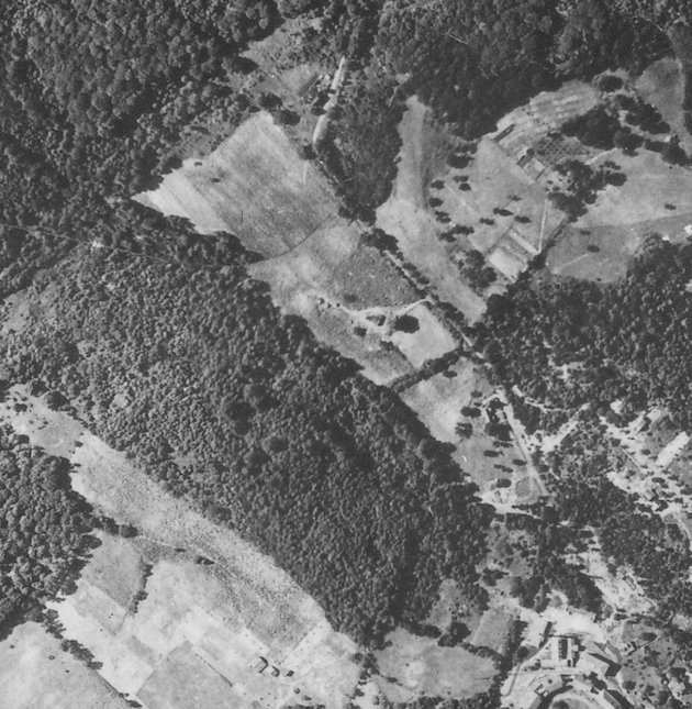 Northwestern Glover Park, before residential development. At upper right, the horseshoe-shaped Mt. Alto Veterans Hospital. Below that, on the other side of Tunlaw Road, farmhouses, pastures and woodlots. (Aerial Photographic Mosaic Map of Washington, D.C., Aerial Photo Section No. 3, Bolling Field – Wash. D.C., U.S. Army Air Service, Sept. 13, 1922 [Library of Congress])