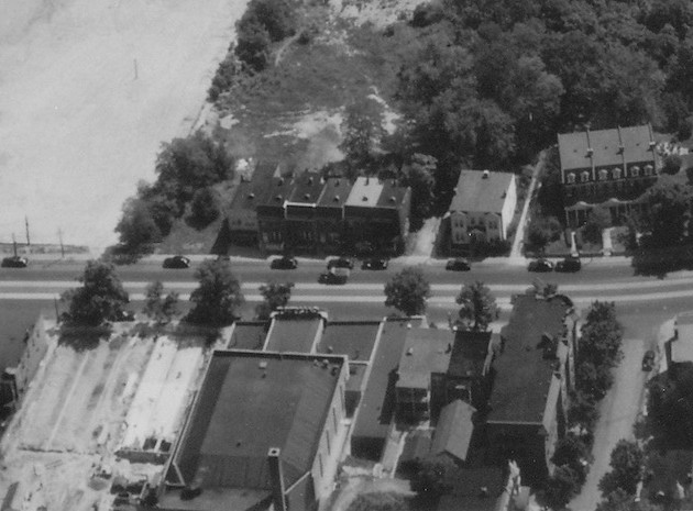 Wisconsin Avenue, above W Place, 1950; in upper right, the Park & Shop Center. (Naval Observatory Archive)
