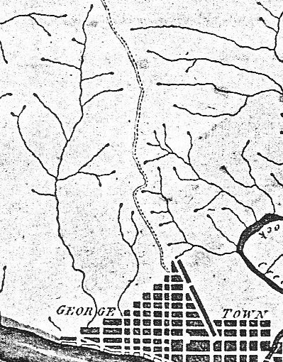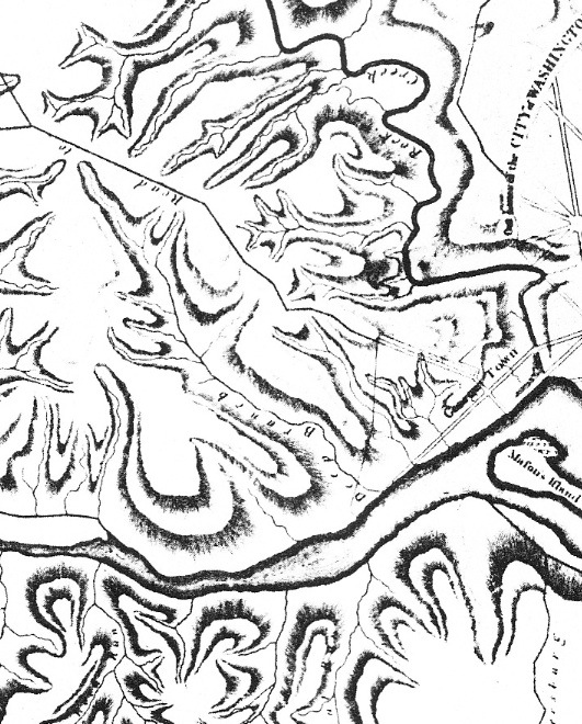 Note the way the path of animal migrations adheres to the divide between watersheds. (Andrew Ellicott, Map of the Territory of Columbia, 1794 , detail)