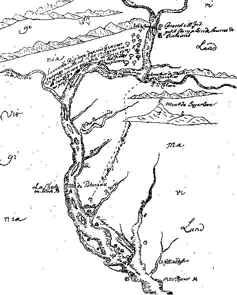The dotted line represents the Indian trail from Col. George Beall’s house, near the confluence of Rock Creek and the Potomac River, past Sugarloaf Mountain, to the Indian town of Canavest, on Heater’s Island, near Point of Rocks, Maryland. The route corresponds, more or less, to Wisconsin Avenue, River Road and Darnestown Road. (Map of the Potomac, 1711, in Baron Christopher von Graffenried, “Relation du Voyage d’Amerique” (1716): see Georgetown Historic Waterfront, pages 8, 9, 11, 85, and 87; Baron Christoph von Graffenried’s New Bern Adventures, facing page 96; German American Annals. v.11-12 (1913-14), facing page 188.)