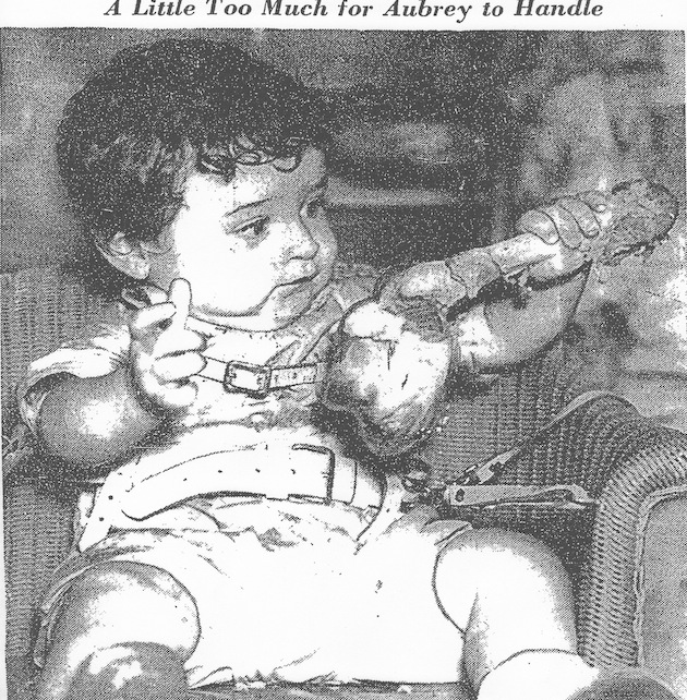 Eleven-month-old Aubrey Reginald, son of Mr. and Mrs. Granville Cannon, of 2214 Tunlaw road northwest, is giving studied thought to the proper technique on a ham bone at the congregational supper held Thursday night at Mount Tabor Methodist Church. Mrs. Cannon was among the church workers.