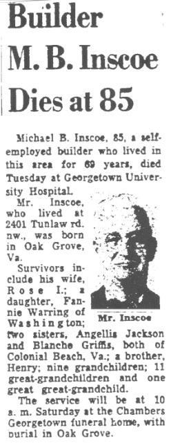 In 1959 Michael B. Inscoe lived at 2401 Tunlaw Road, and his connection with the neighborhood exceeded forty years.