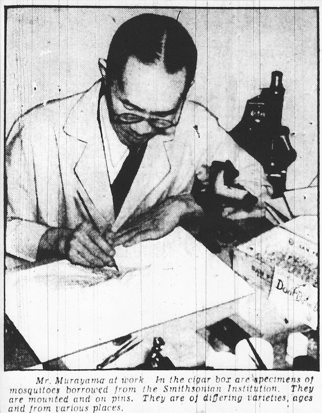 “First of Mosquito Eggs Hatches for Portrait”, Washington Post, December 15, 1938, pp.3,12 (photo). Synopsis: Hashime Murayama, staff artist of National Geographic executes drawings of the life-cycle of mosquitoes.