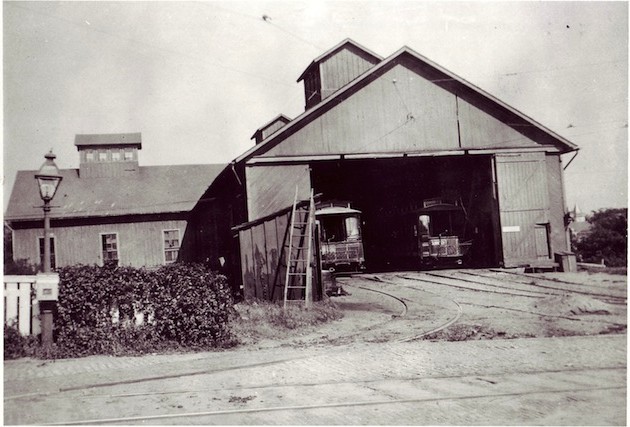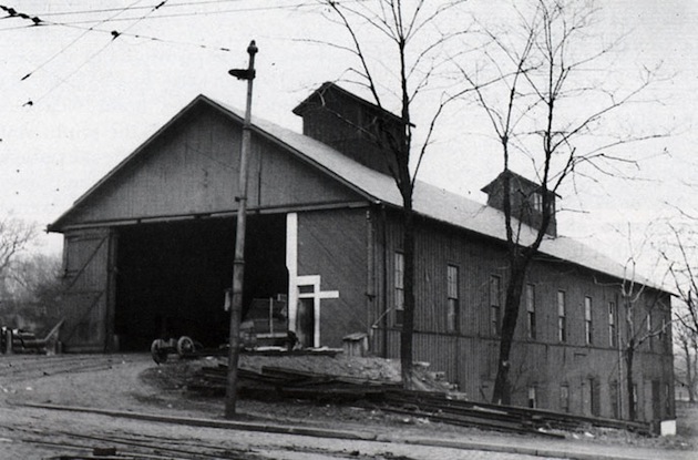 “The Georgetown and Tenallytown barn, on the east side of Wisconsin Avenue at Calvert Street. It had a coal fired steam power plant. The picture, probably taken in 1900, shows two ex-Columbia 60-69 series center aisle open motors in the barn.” (LeRoy King, 100 Years of Capital Traction)