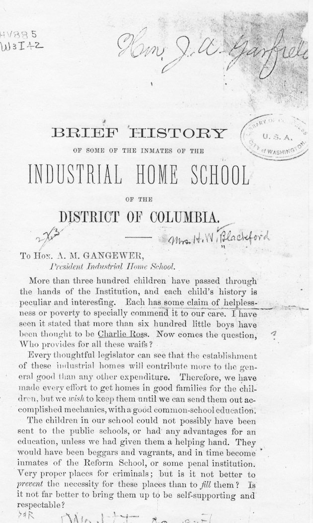 (Brief History of Some of the Inmates of the Industrial Home School of the District of Columbia, Mrs. H. W. Blackford, to Hon. A.M. Gangewer, President Industrial Home School, Georgetown D.C., February 17, 1875 [Library of Congress])