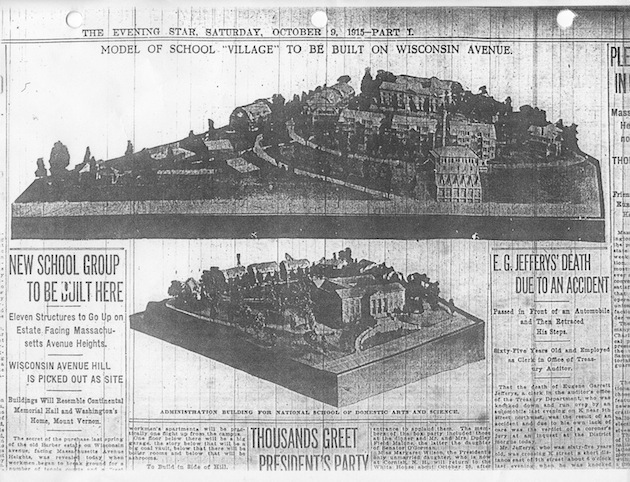 “New School Group To Be Built Here––Eleven Structures to Go Up on Estate Facing Massachusetts Avenue Heights.––Wisconsin Avenue Hill Is Picked Out As Site––Buildings Will Resemble Continental Memorial Hall and Washington’s Home, Mount Vernon.––The secret of the purchase last spring of the old Barber estate on Wisconsin Avenue, facing Massachusetts Avenue Heights, was revealed today when workmen began to break ground for a number of tennis courts and a “rest house” at the rear of the seven acres comprising the property, and it was ascertained that a group of white stone buildings is to be erected on the estate for the National School Of Domestic Arts and Science. The owners of the school said today that the investment involved will be a little inside of $1,000,000. The buildings will cost about $500,000, and between $240,000 and $500,000 is understood to have been paid for the land last spring.”