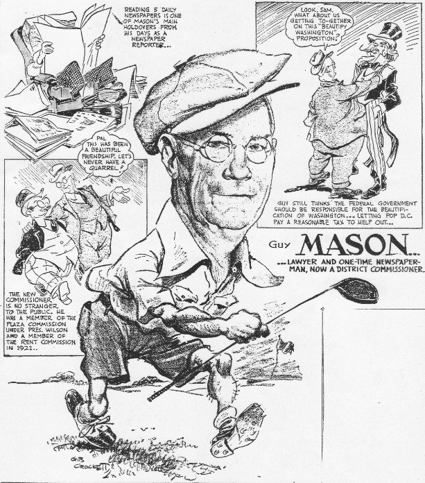 Washington historian Constance Green (who characterized the District commissioners as generally unable to delegate responsibility, or to exercise effective control) describes Commissioner Mason as highly competent, though lacking in experience. But his scant regard for taxpayers does much to explain why the commissioner system found few local defenders in its final decades.  (“Guy Mason, 74, Dies; Served As Commissioner 10 Years”, Star, July 11, 1955; Green, Washington: A History of the Capital, 1800-1950, v.2, 473)