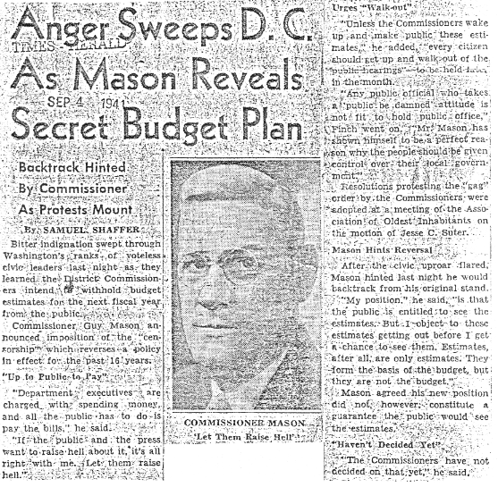 As a presidentially appointed commissioner, Mason was under no great obligation to consult the vote-less citizens of Washington, and incurred no great risk if he offended them. In his first year in office, Commissioner Mason reversed a longstanding policy of sharing District budget estimates with the public, explaining that “all the public has to do is pay the bills.” “If the public and the press want to raise hell about it, it’s all right with me. Let them raise hell.” Mason’s two fellow commissioners, alarmed at the widespread indignation that followed, were obliged to overrule him, but there was no political penalty.  (“Anger Sweeps D.C. As Mason Reveals Secret Budget Plan––Backtrack Hinted By Commissioner As Protests Mount”, Times Herald, September 4, 1941)