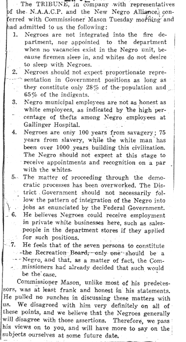 The African-American press noted that Commissioner Mason, unlike most of his predecessors, did not disguise his prejudices.  (“An Editorial––Commissioner Mason Speaks Out”, Washington Tribune, May 9, 1942)