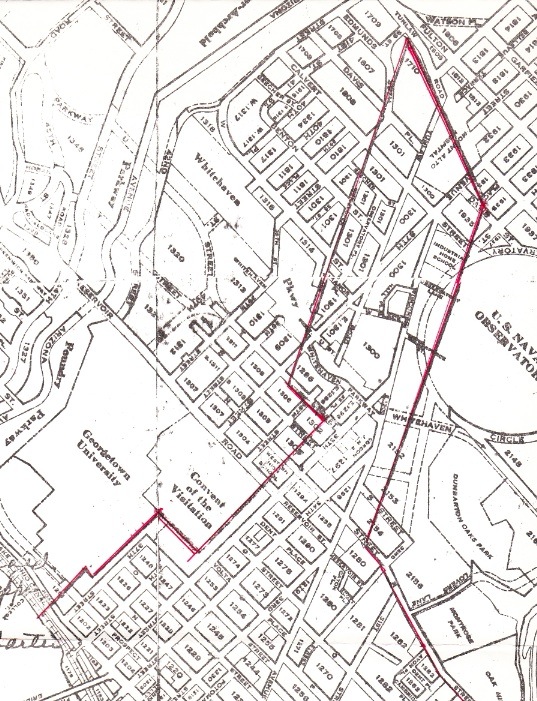 The characteristic shape of Salcom and Knaves Disappointment is reflected in the northern boundaries of colonial Georgetown, which were were confirmed by Congress––”An Act Amending the Charter of Georgetown,” March 3, 1809. They are shown in red on a modern street map. (Map prepared in 1974 by Col. Robert B. Curtiss, of the Burleith Citizens Association.)