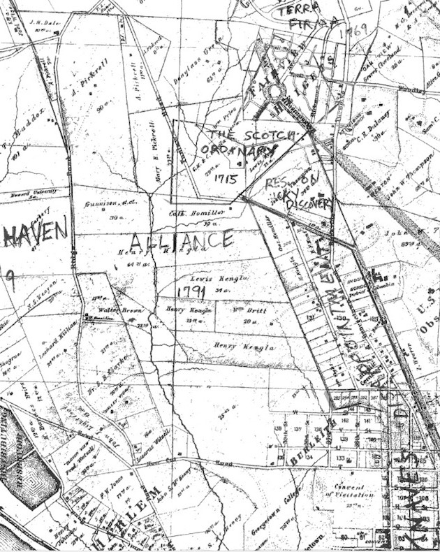 The fact that this tract sometimes appears, in later documents, as Scott’s Ordinary may have to do with the fact that“scotch ordinary” was once a jocular term for a privy. The names of land tracts––Knave’s Disappointment, Poor Tom’s Last Shift, Arell’s Folly, for example––were sometimes less than flattering. (H.C. Gauss, “The Title Deeds of the City of Washington”, Records of the Columbia Historical Society of Washington, 1915, Volume 18, p.46; Eric Partridge, A Dictionary of Slang and Unconventional English, 2006)