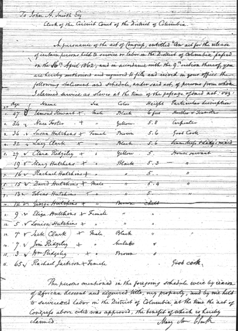 In 1862, when slavery ended in the District of Columbia, Mary Ann Clark filed for compensation for sixteen slaves, among them, Lucy Clark, given to her by Maynadier Mason 1853: