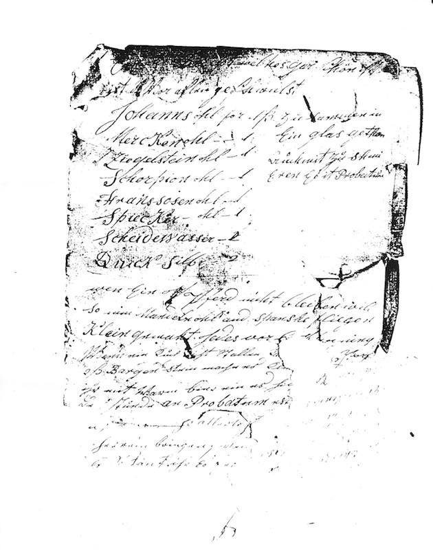 Ledger pages; the second page appears to record proven (“Probatum”) remedies for curing a lame horse––perhaps connected with Scheele’s original calling as a blacksmith––containing nitric acid (“Scheidewasser”) and mercury (“Quicksilber”), almonds (“Mandeln”), and Spanish Fly (“Spansche fliegen”). (Courtesy of a descendant.)
