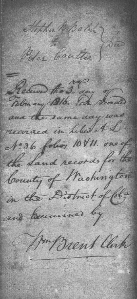 Peter Coulter to Augustus Daniel Scheele, both of Washington County, for $300, two lots “ in a village laid off by the Rev. Mr. Balch in George Town called Wilberforce”. Coulter also sells Scheele his stock in trade, consisting of coarse liquors. (DC Liber AN38 (1817) f.389)